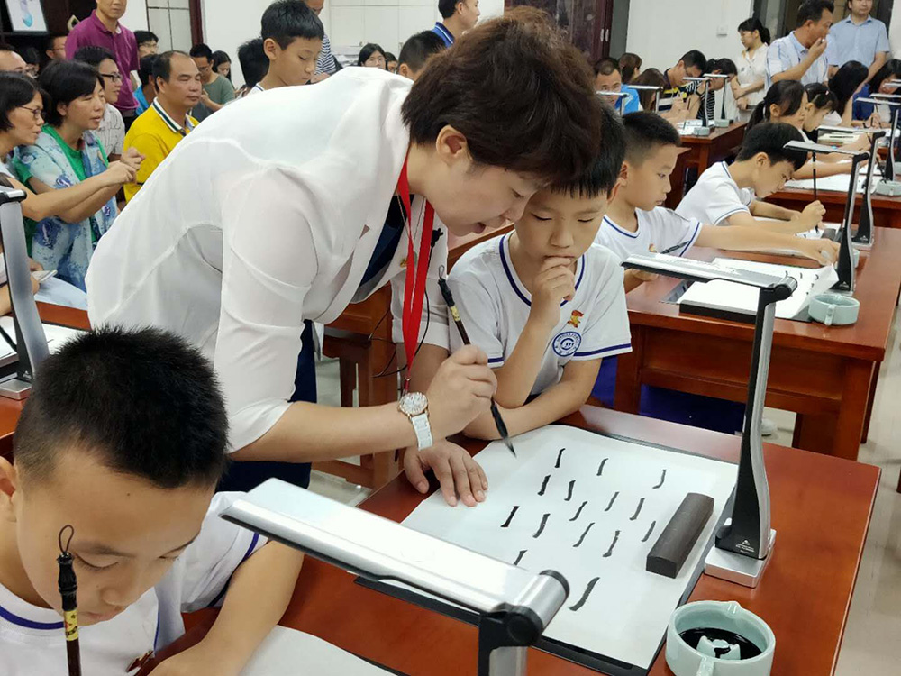 課堂上,姚丹校長通過吉星的書法系統(tǒng),即時的展示自己的書寫過程,一筆一劃讓臺上臺下一目了然。對于書寫中的細(xì)節(jié),老師邊寫邊逐步分析。