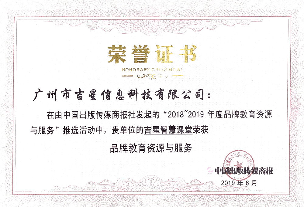 由中國(guó)出版?zhèn)髅缴虉?bào)社發(fā)起的“2018~2019年度品牌教育資源與服務(wù)”推選活動(dòng)中,吉星智慧課堂榮獲“品牌教育資源與服務(wù)”榮譽(yù)稱號(hào)。