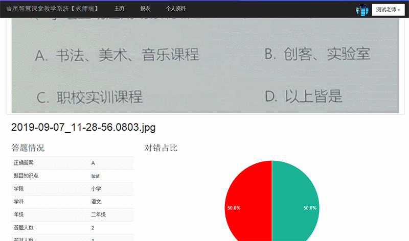 老師通過視頻采集書本題目,啟動(dòng)客觀題答題功能,學(xué)生根據(jù)拍照的題目進(jìn)行ABCD或?qū)﹀e(cuò)進(jìn)行答題。答完題后,老師公布答案,系統(tǒng)根據(jù)答案進(jìn)行即時(shí)自動(dòng)分析。