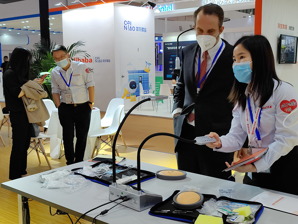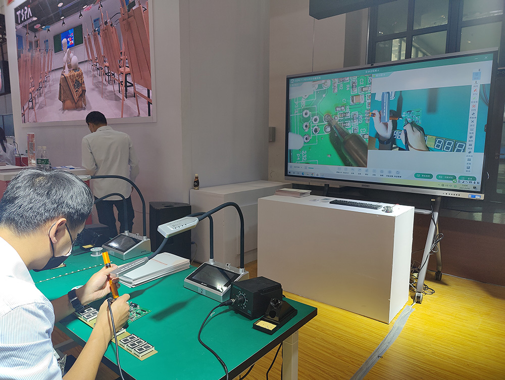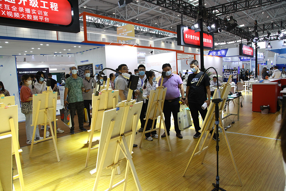 現(xiàn)場最吸睛的莫過于是實訓(xùn)5G無線全錄播系統(tǒng)展區(qū)了,來往的觀眾紛紛舉起了手機(jī)拍攝系統(tǒng)運行的過程,精心布置的展區(qū)現(xiàn)場直觀展示了全錄播系統(tǒng)與繪畫、烹飪、醫(yī)護(hù)、電子雕刻等不同職教場景的高度融合。