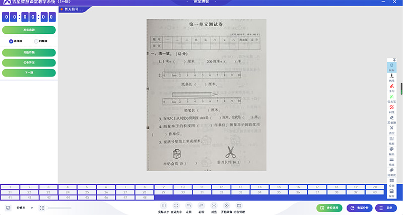 教師通過大屏展示測驗(yàn)考題,將紙質(zhì)試題轉(zhuǎn)化電子形式展示,節(jié)約成本的同時也能夠讓學(xué)生清晰地看到試題。學(xué)生通過按鈕進(jìn)行作答,大屏實(shí)時展示答題狀況。