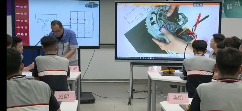 在強交互實訓(xùn)課堂中,跨區(qū)域教學(xué)是重點。在展會上,工作人員會演示相隔距離的異地教學(xué),展示不同時間空間的同步課堂。