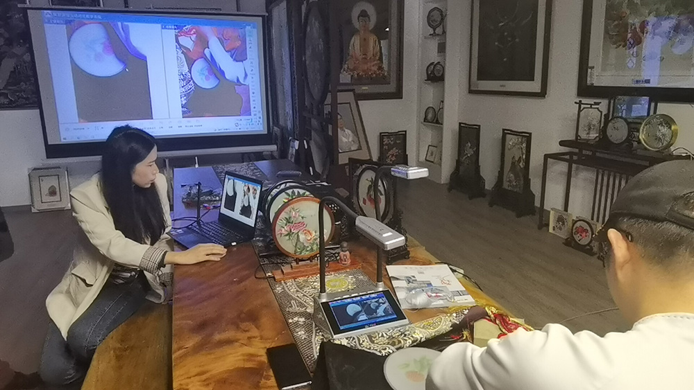 在現(xiàn)場,吉星無線全錄播通過5G傳輸,將王新元大師刺繡的針路、刺繡的手法和技巧實時清晰投放至大屏上。和過往的圍觀教學(xué)相比,這樣的教學(xué)質(zhì)量更好、效率更高。