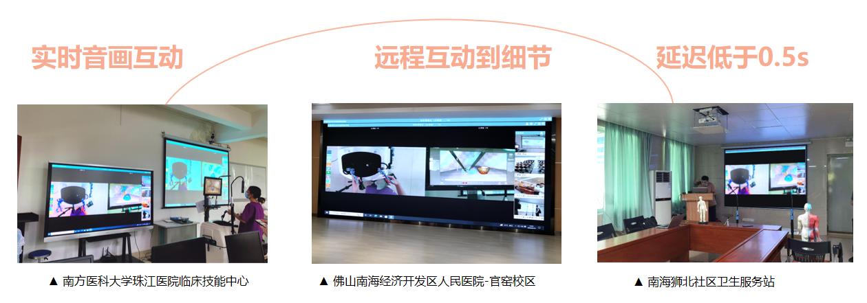 南方醫(yī)科大學(xué)珠江醫(yī)院臨床技能中心通過多模態(tài)強(qiáng)交互系統(tǒng),實(shí)現(xiàn)與南海經(jīng)濟(jì)開發(fā)區(qū)人民醫(yī)院-官窯校區(qū)、獅北服務(wù)站3方互聯(lián)互通,進(jìn)行遠(yuǎn)程培訓(xùn),異地展示老師的手法和機(jī)器內(nèi)部的操作細(xì)節(jié),異地培訓(xùn)教學(xué)也可達(dá)到面對(duì)面效果,共享優(yōu)質(zhì)的醫(yī)療設(shè)備資源,擴(kuò)大名師的教學(xué)受眾面,提高培訓(xùn)的質(zhì)量。