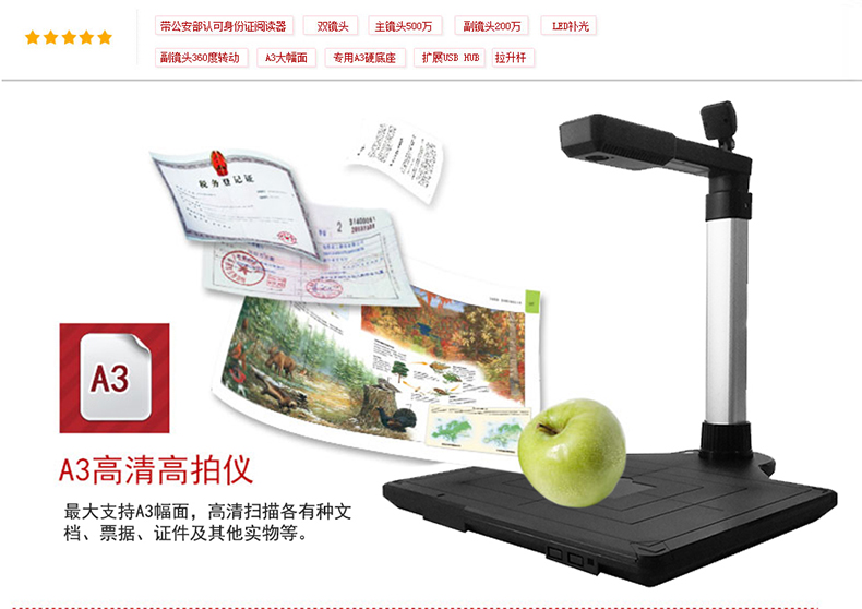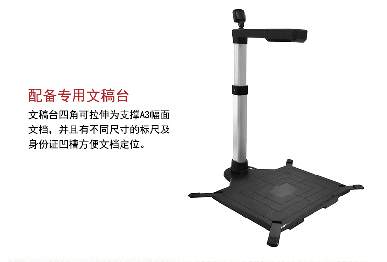 固定可伸縮底座(底座可依據(jù)所掃描文件及物品的幅面范圍滑動(dòng)調(diào)節(jié)) |