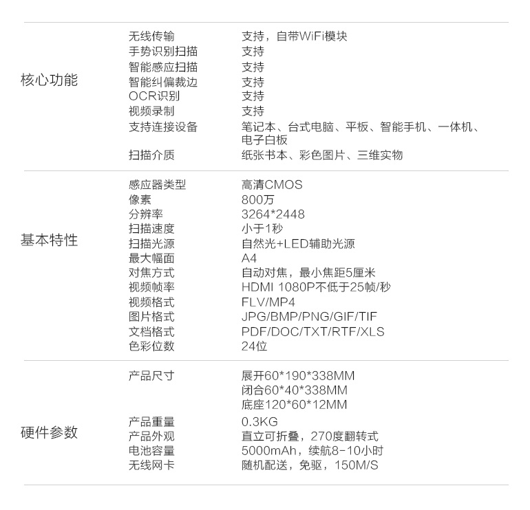 核心功能 無(wú)線傳輸、手勢(shì)識(shí)別掃描、智能感應(yīng)掃描、智能糾偏裁邊、OCR識(shí)別、視頻錄制等