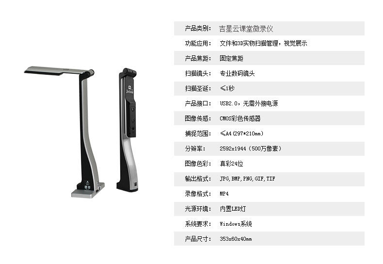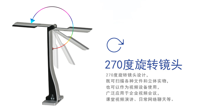 拍攝鏡頭 機械折臂270度翻轉(zhuǎn)式:90度可拍攝文稿;180度可拍攝課堂活動,用作簡易的錄播系統(tǒng);270度可錄制微課